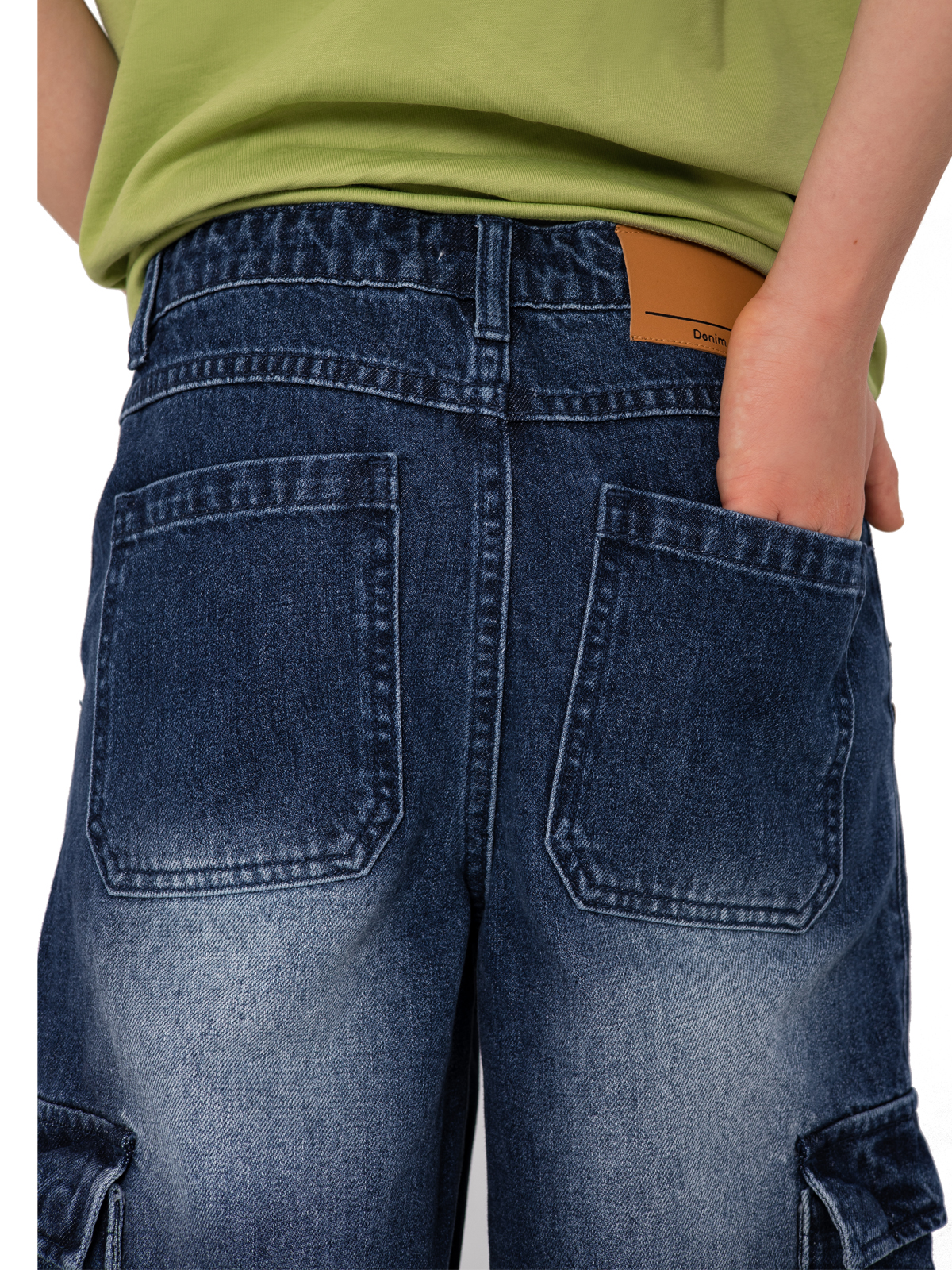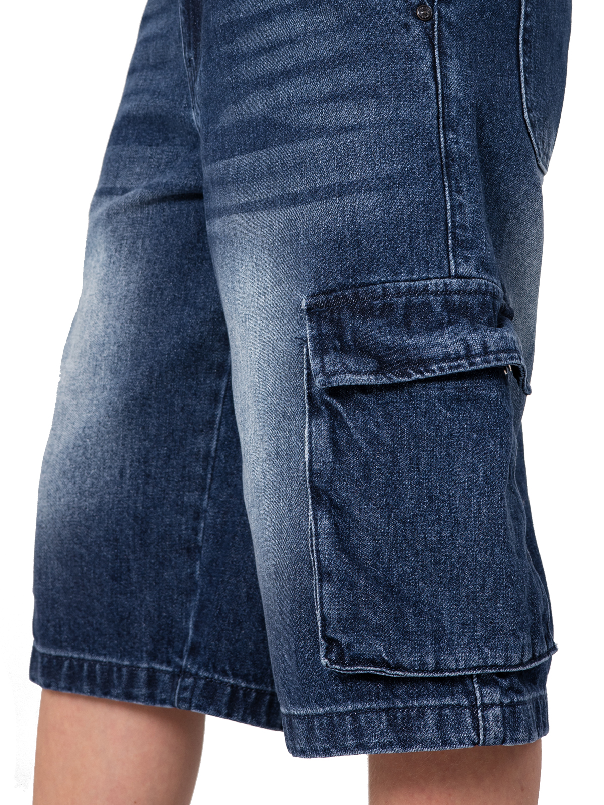 Удлиненные синие джинсовые шорты-карго с потертостями - идеальный вариант летнего гардероба. Накладные карманы делают модель особенно удобной и практичной. Удобная средняя посадка и легкий приятный деним безусловно понравятся обладателю данной модели.