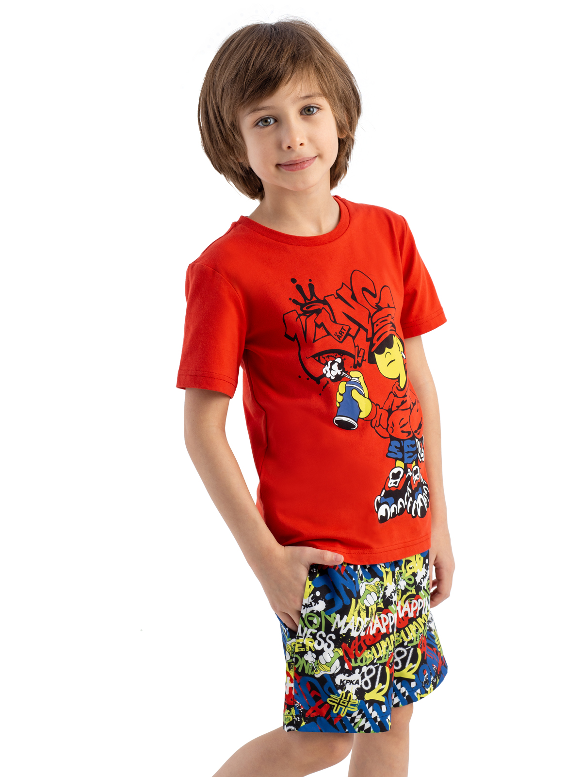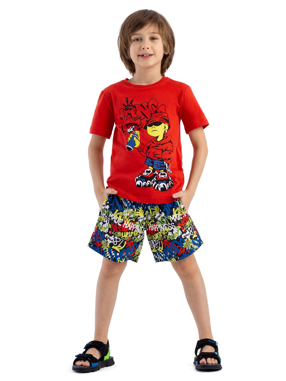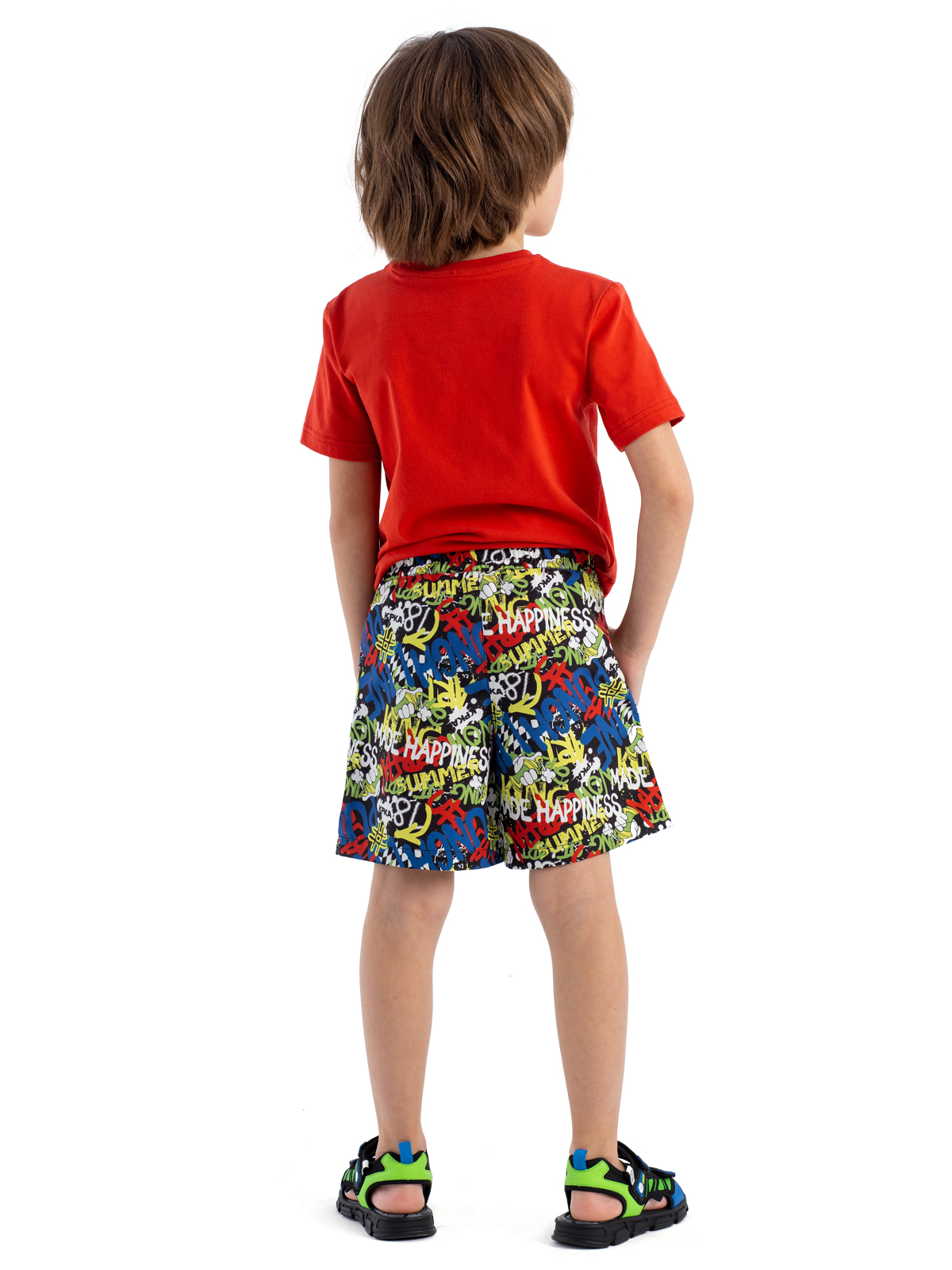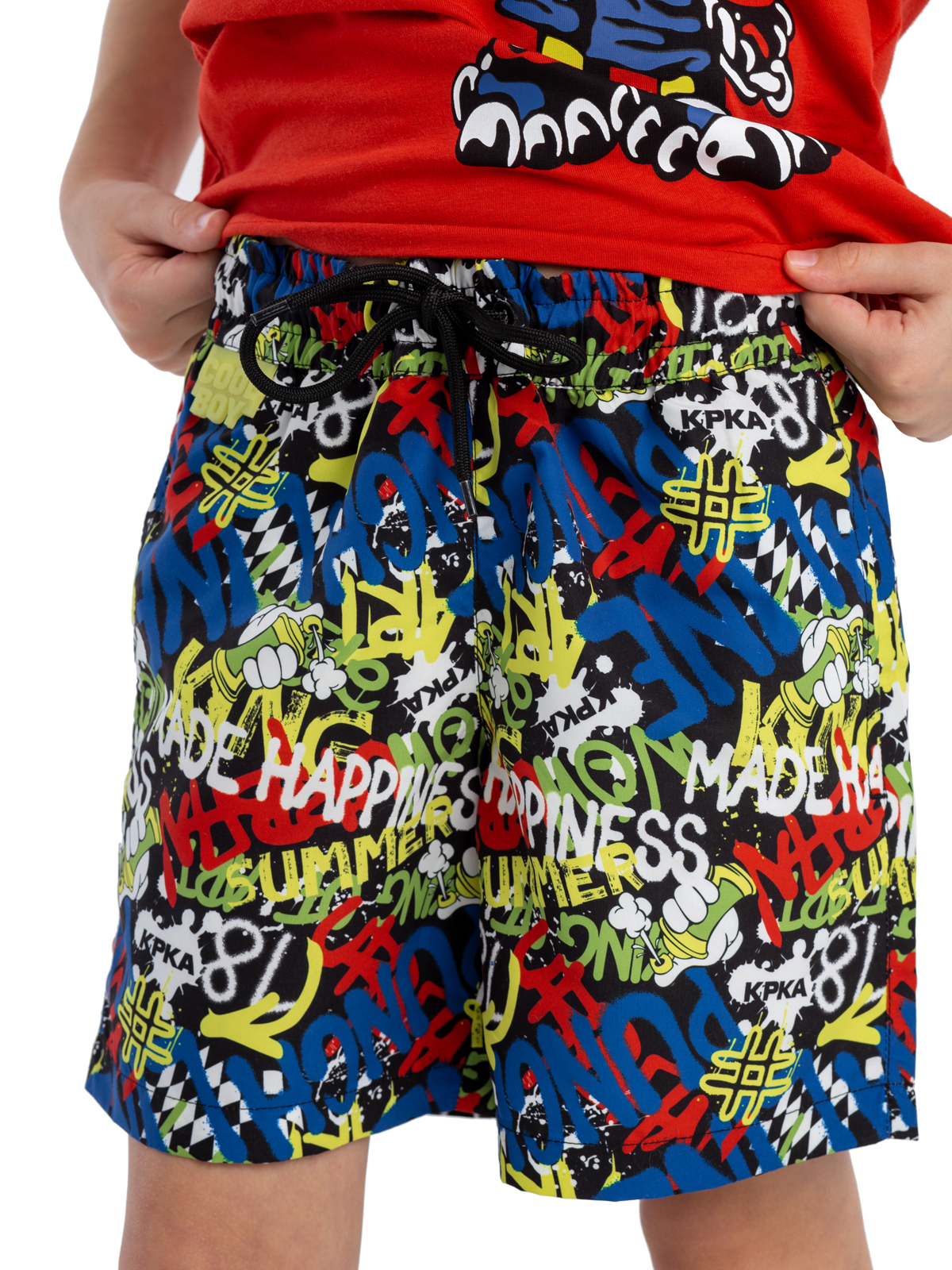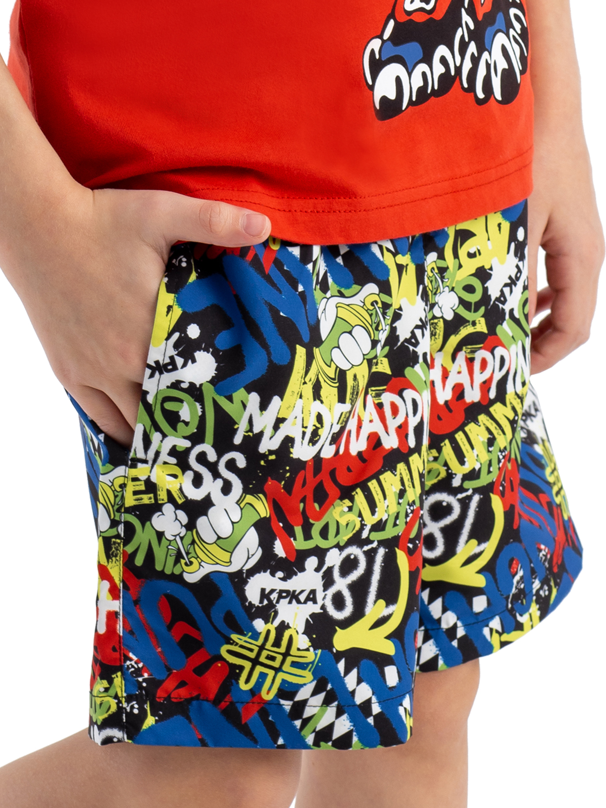 Летние широкие шорты для мальчика выполнены из быстросохнущего, эластичного материала в принте-граффити. Шорты имеют внутренние плавки из мягкой сетки, вшивную резинку на талии, шнурок-завязку для регулировки. Благодаря дышащей и эластичной ткани не раздражающей кожу - шорты подойдут не только для плавания, но и для повседневной носки. Модель имеет два функциональных боковых кармана.
