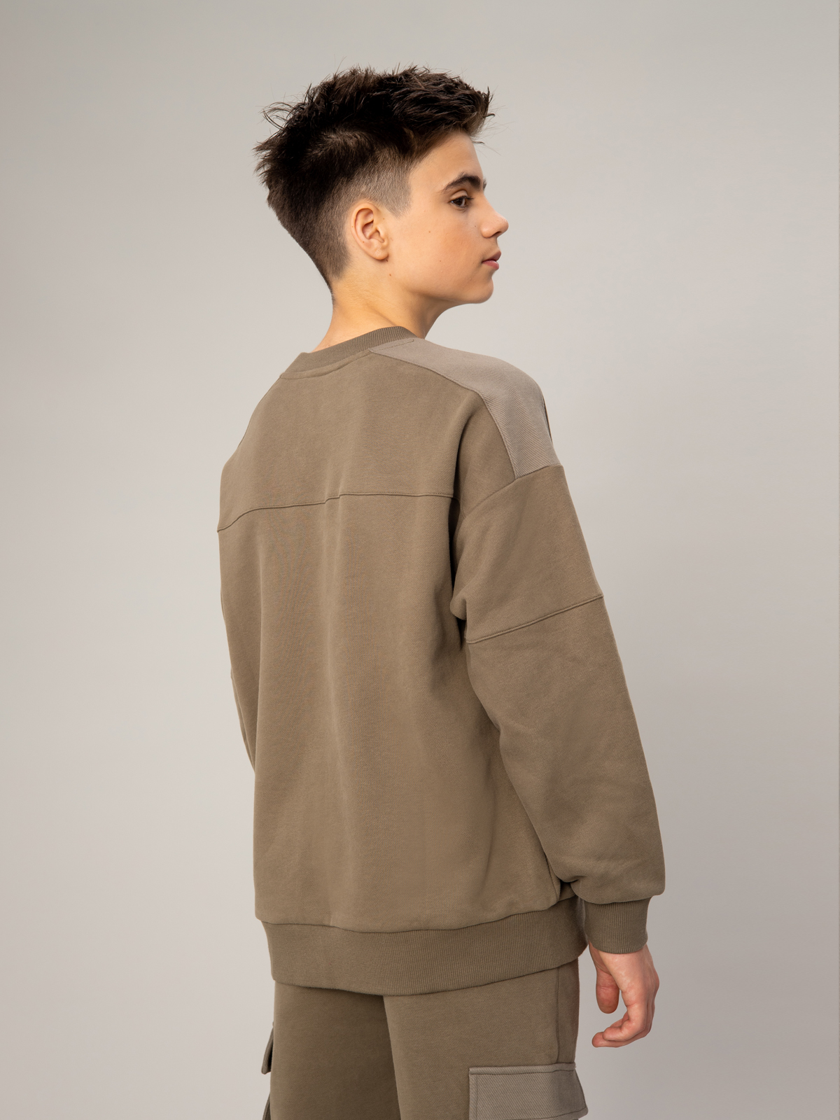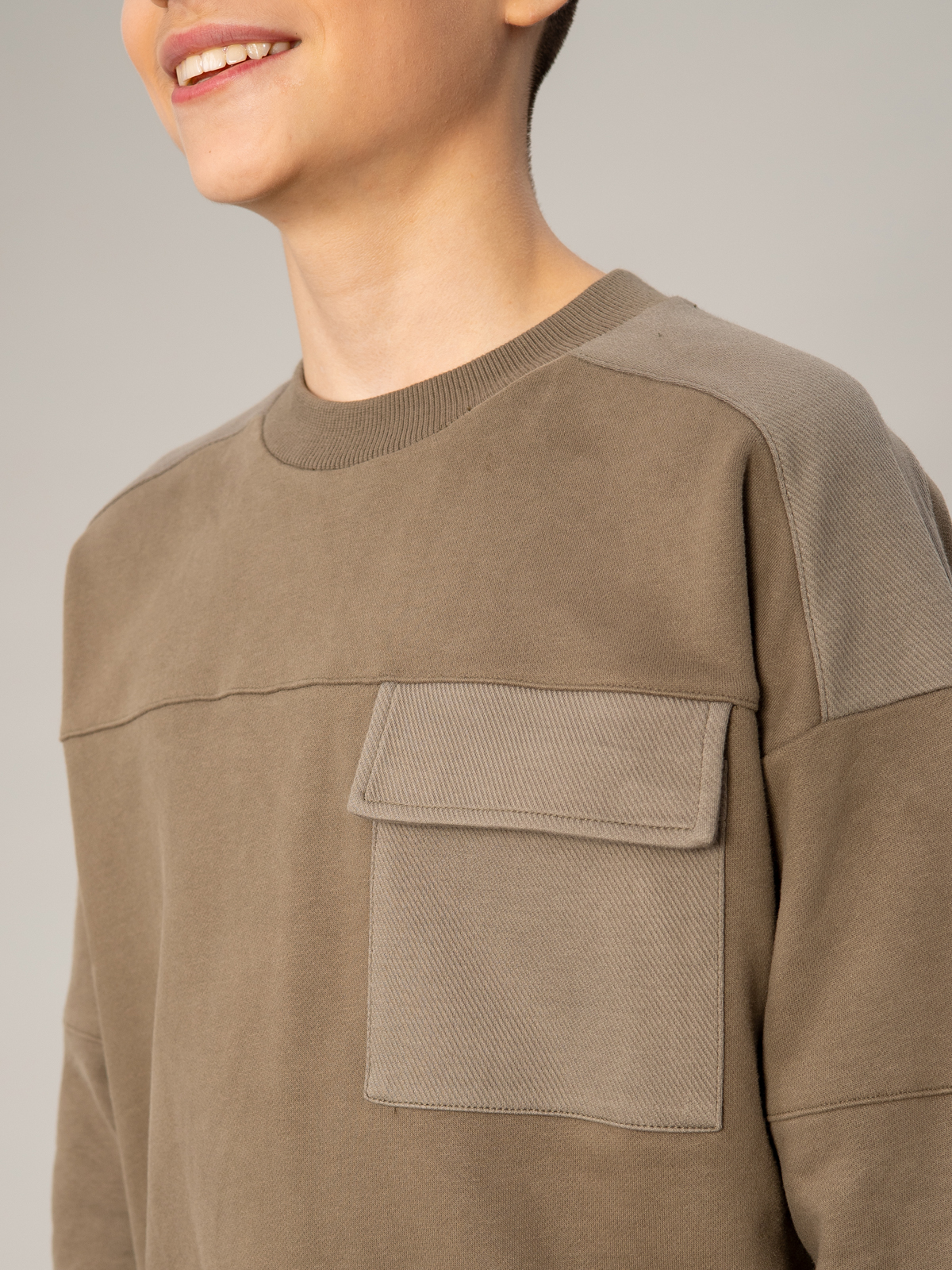 Стильный свитшот цвета хаки для мальчика отличается продуманным дизайном. Модель оснащена накладным карманом с клапаном на груди и вставками по плечам из аналогичной ткани. Патч на рукаве придаёт изделию индивидуальность. Свободный силуэт и спущенный рукав обеспечивают комфортную посадку. Материал — мягкий хлопок с полиэстером — гарантирует приятные тактильные ощущения. Эластичные рибы по горловине, манжетам и низу сохраняют форму. Практичная модель идеальна для повседневной носки и активного отдыха.