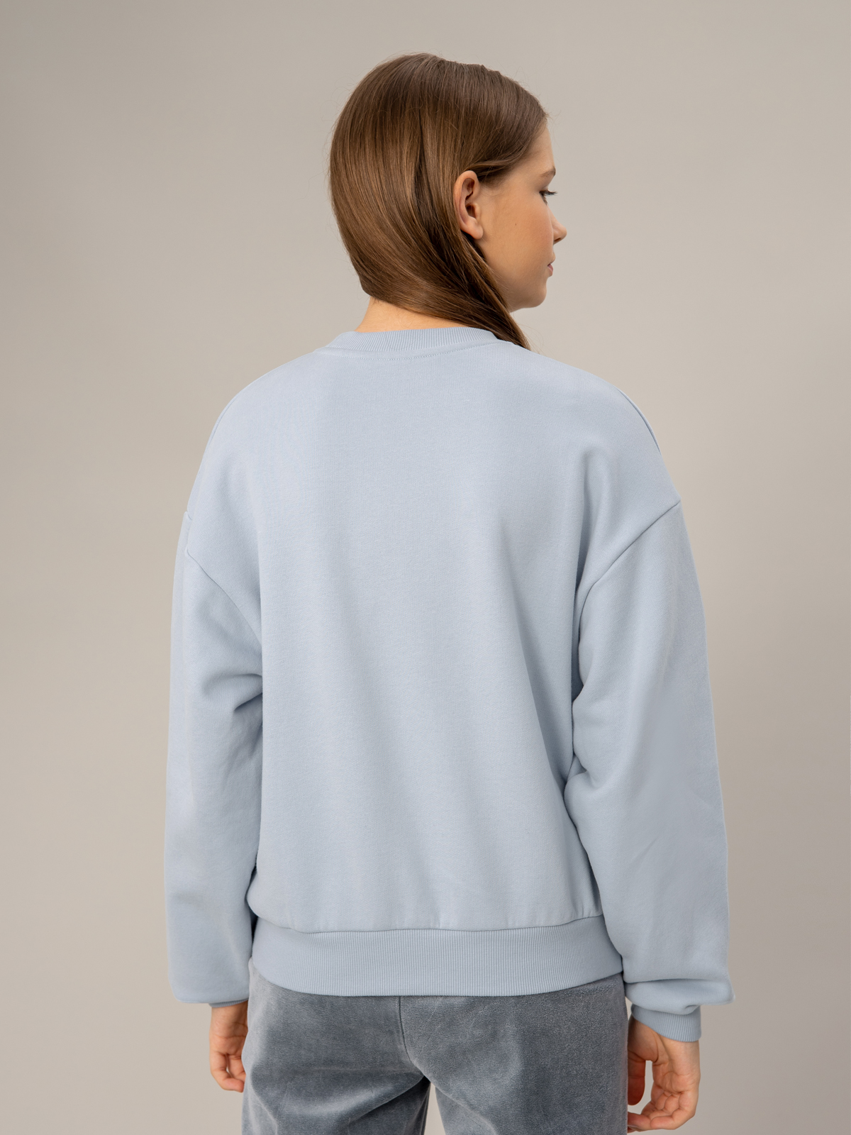 Свитшот для девочки в голубом цвете украшен изящной вышивкой на груди, которая гармонично сочетается с основным оттенком изделия. Благодаря точно подобранному цвету вышивки модель выглядит особенно аккуратно и стильно. Материал — мягкий хлопок с добавлением полиэстера, что обеспечивает комфорт при носке и долговечность изделия. Эластичные рибы по низу изделия, на манжетах и по горловине гарантируют идеальную посадку и сохраняют форму после множества стирок. Эта модель отлично подходит как для повседневной носки, так и для активного отдыха. Практичная ткань не требует сложного ухода и надолго сохраняет привлекательный внешний вид.
