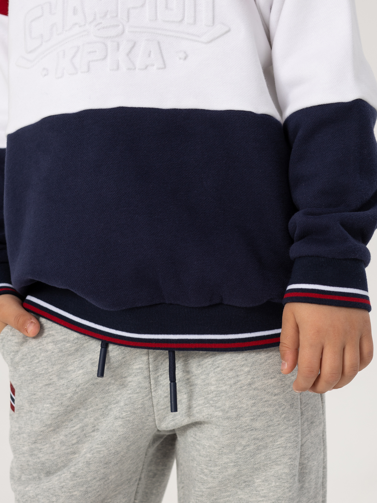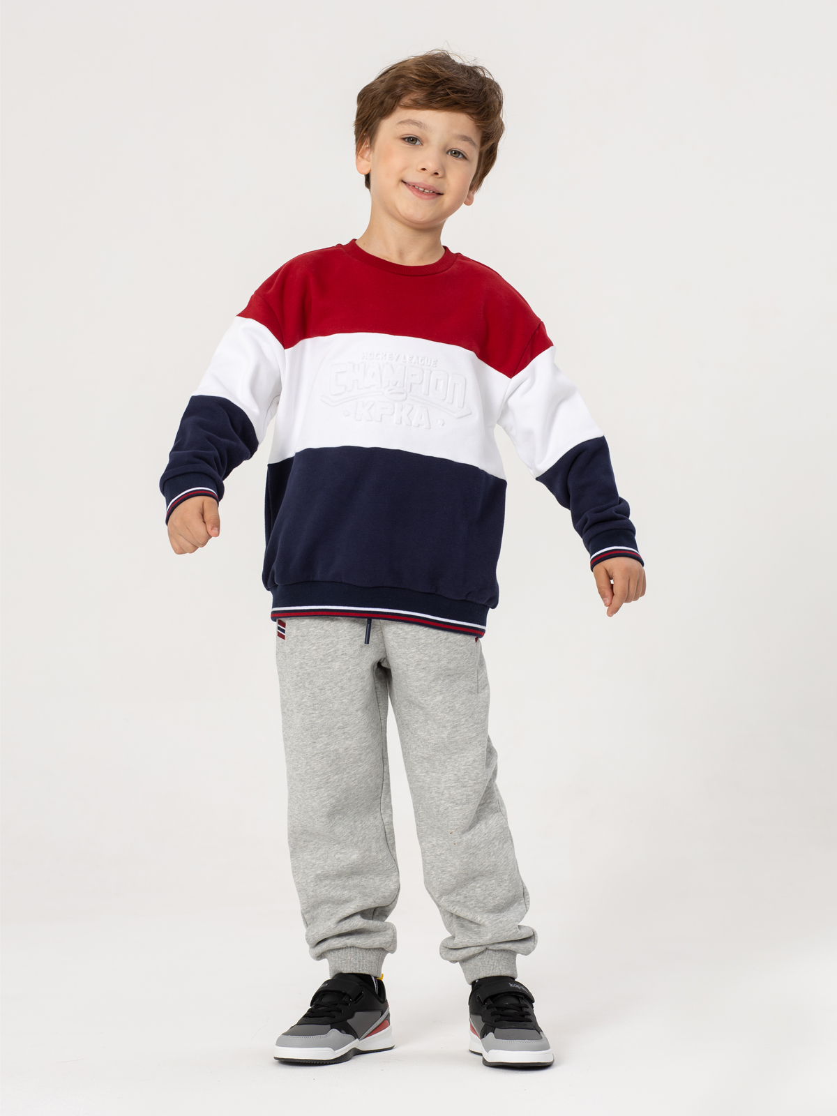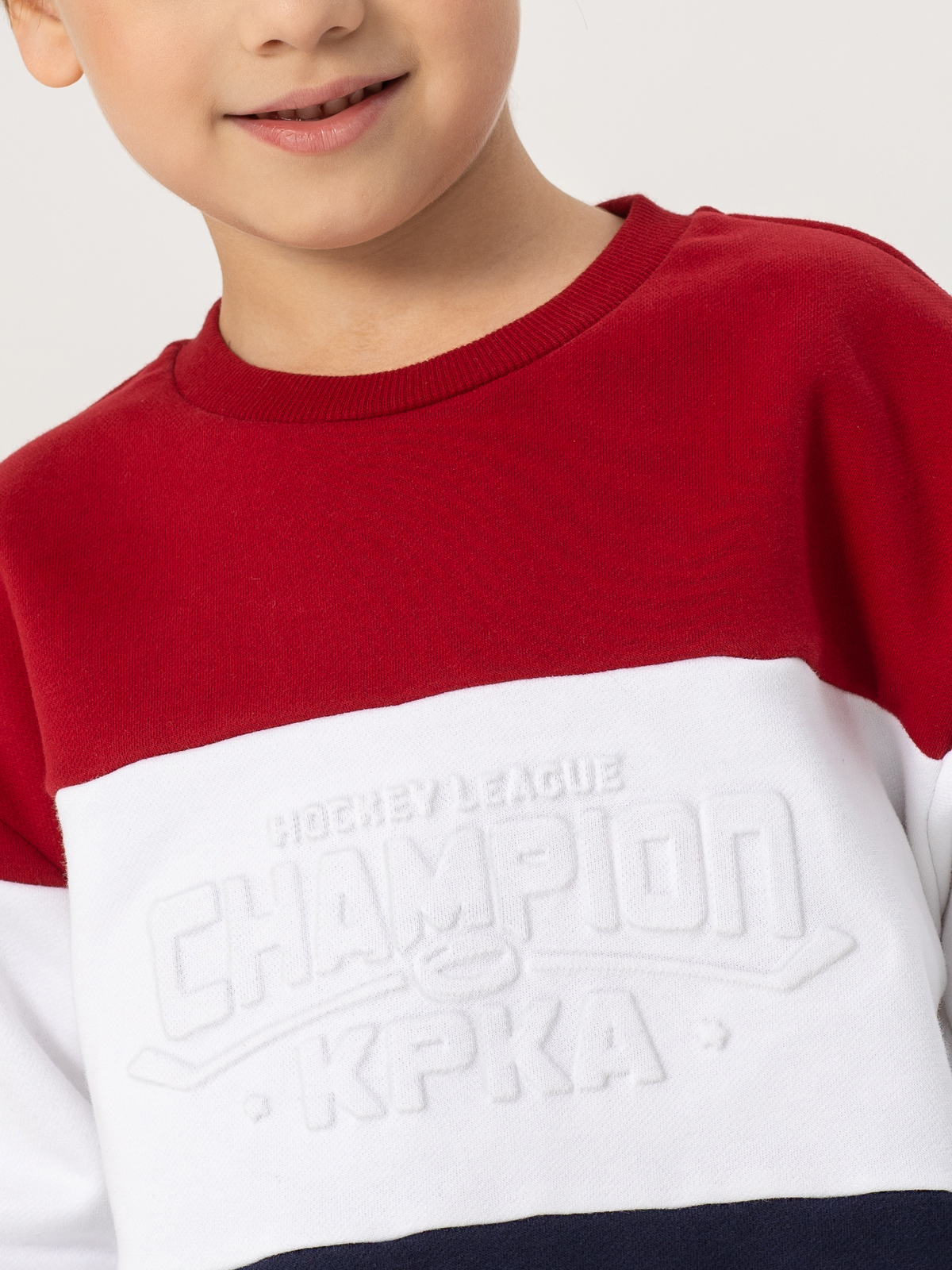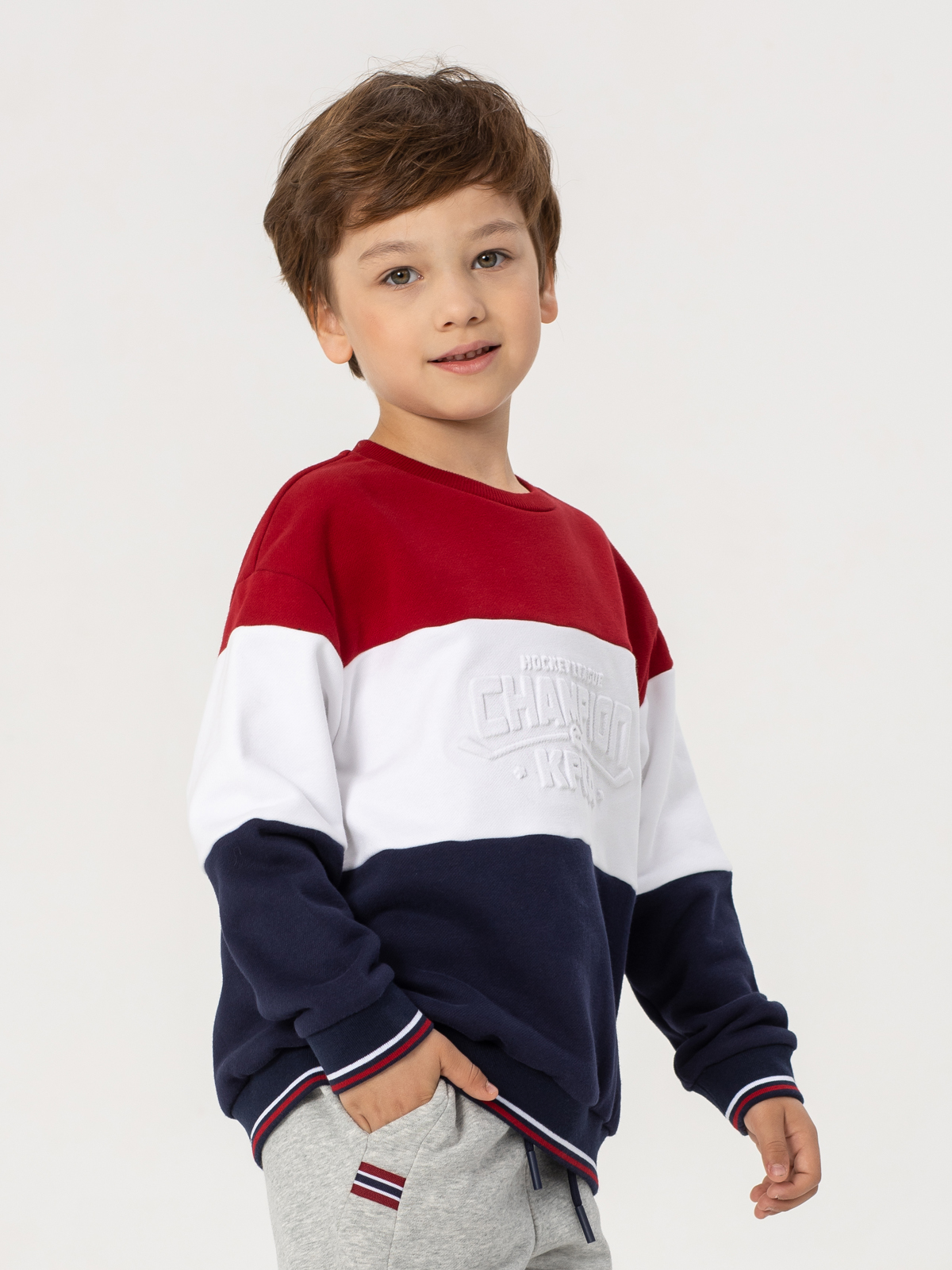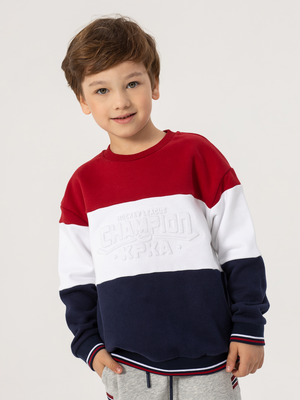 Яркий свитшот для мальчика висполнении колор-блок — сочетание контрастных красного, белого и синего цветов. Модель привлекает внимание современным дизайном и продуманными деталями. Особую практичнойсть придают рибы по низу изделия, рукавов и горловине. Декоративное тиснение на груди добавляет модели индивидуальности. Мягкий материал из хлопка с добавлением полиэстера и тёплым начёсом с внутренней стороны обеспечивает комфорт при носке. Свитшот отлично подойдёт как для повседневной носки, так и для создания стильных образов, сочетая в себе удобство и модный дизайн.