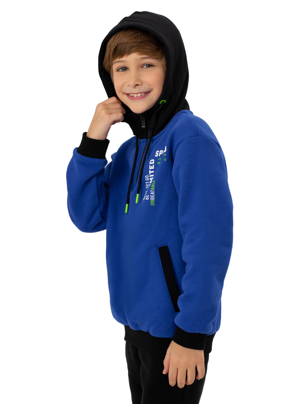 Стильная синяя толстовка для мальчика привлекает внимание своим оригинальным дизайном: контрастный чёрный капюшон с яркими салатовыми акцентами создаёт модный образ. Модель оснащена удобной застёжкой half-zip, которая позволяет регулировать уровень открытости. На груди расположен привлекательный принт, а два вместительных кармана на молниях обеспечивают безопасное хранение мелочей. Чёрные мягкие рибы по низу изделия и на рукавах гарантируют комфортную посадку и защиту от ветра. Эта современная толстовка станет отличным выбором для повседневной носки и активного отдыха. Сочетание качественных материалов и продуманного дизайна делает её незаменимой частью гардероба ребёнка.