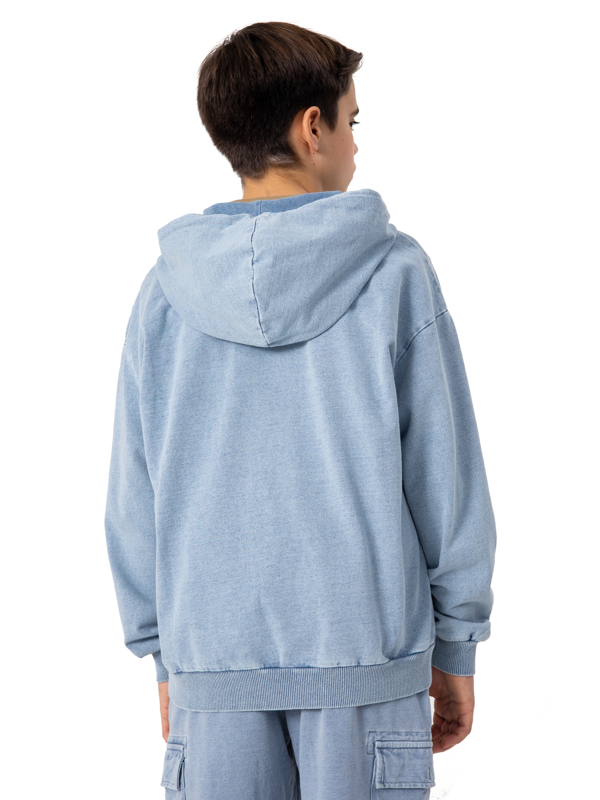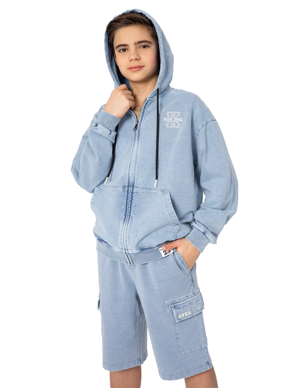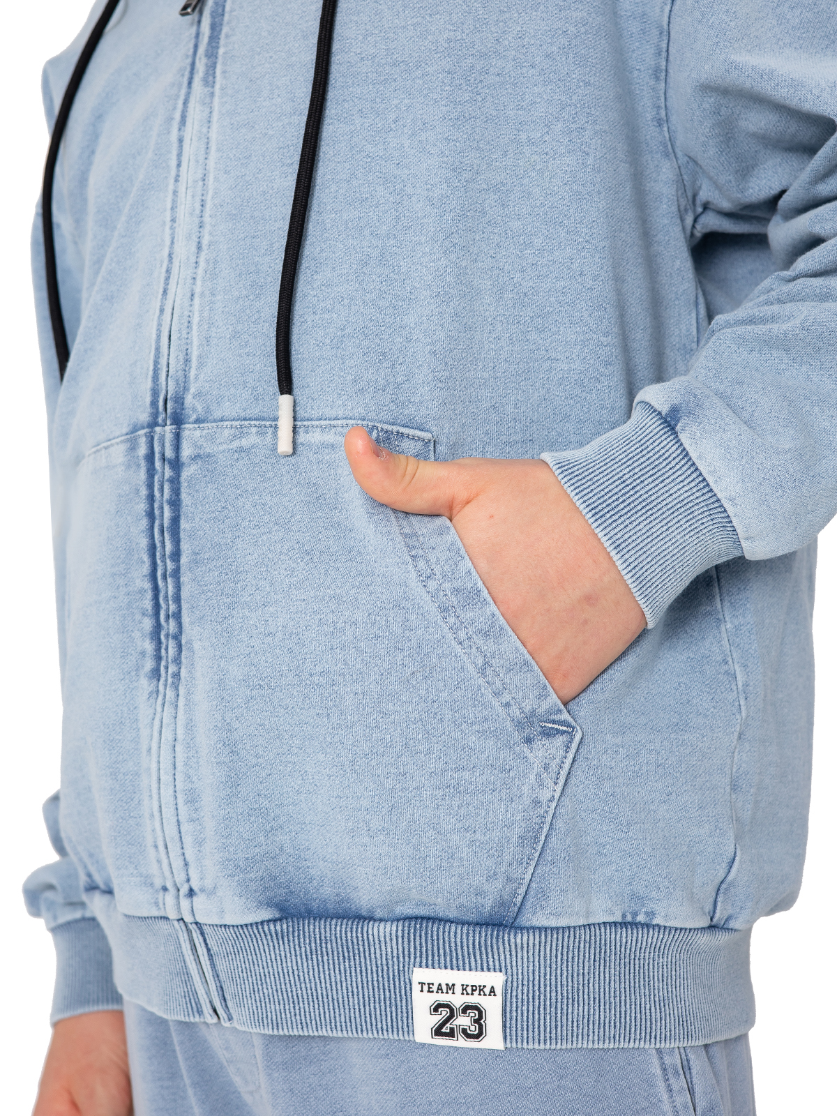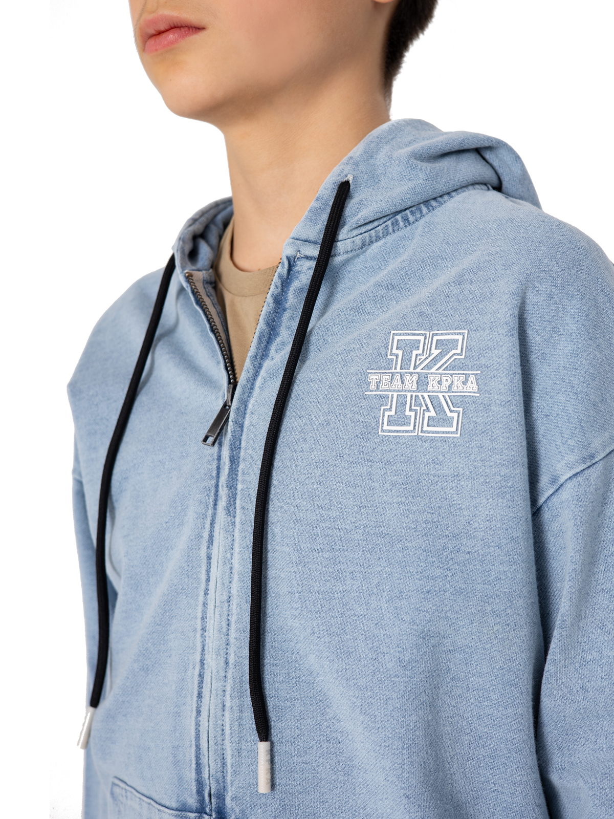 Трикотажная толстовка с имитацией денима небесно-голубого цвета, который можно по праву назвать лучшим по сочетаемости с другими цветами летней палитры. Выполнена из качественного футера: этот материал гипоаллергенен, пропускает воздух и позволяет коже дышать. Толстовка оснащена удобными карманами, имеет капюшон и молнию. Манжеты выполнены из трикотажного риба. Акцентом изделия является термопринт. Комбинируется с шортами арт. NJBCH10-Z2 и футболкой арт. NJBCT20-Z2