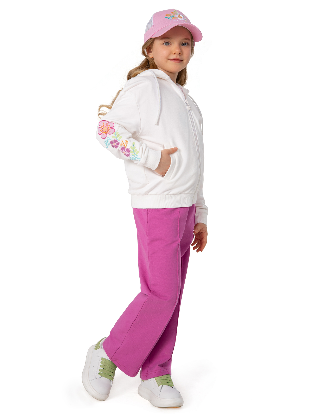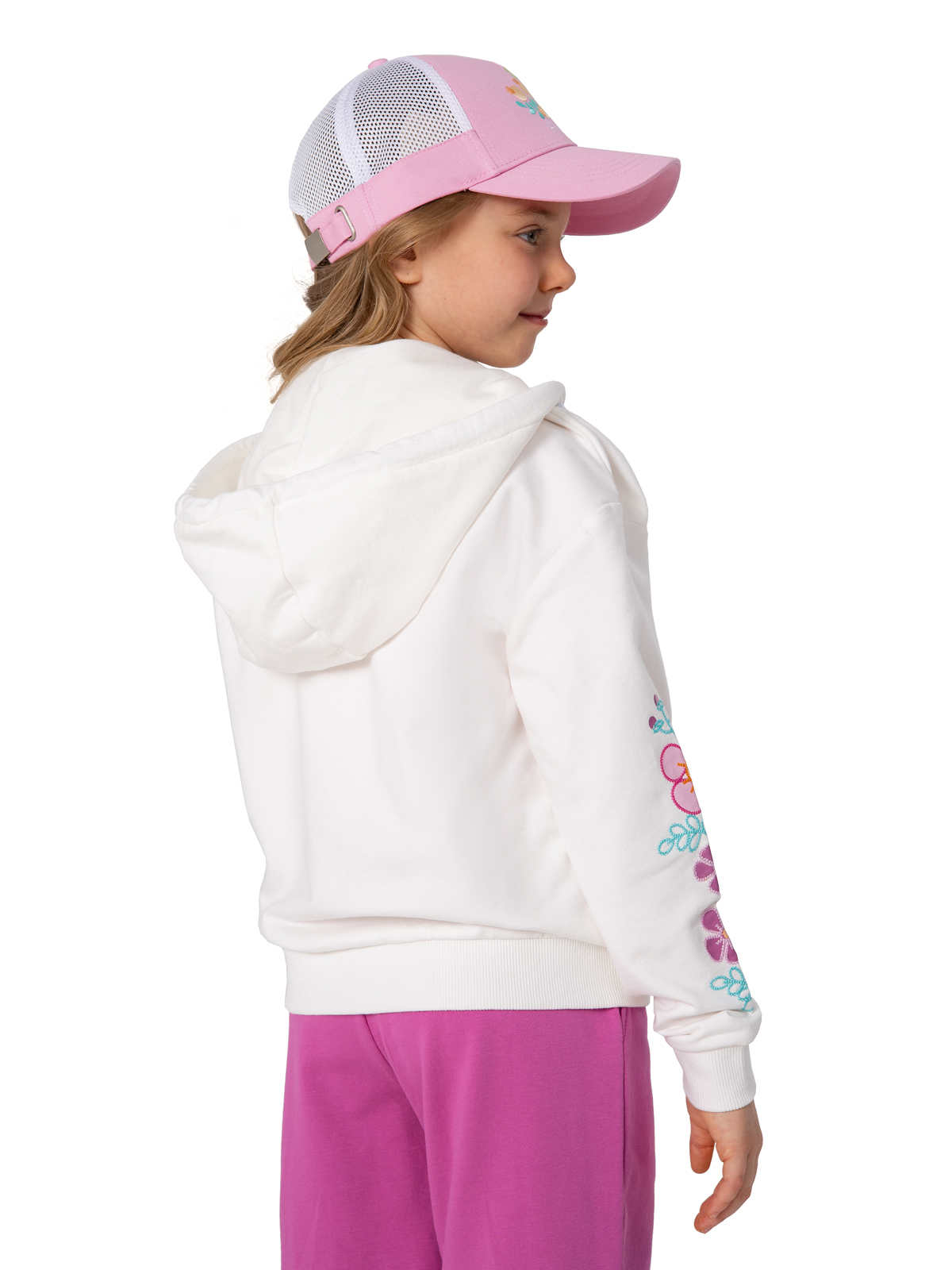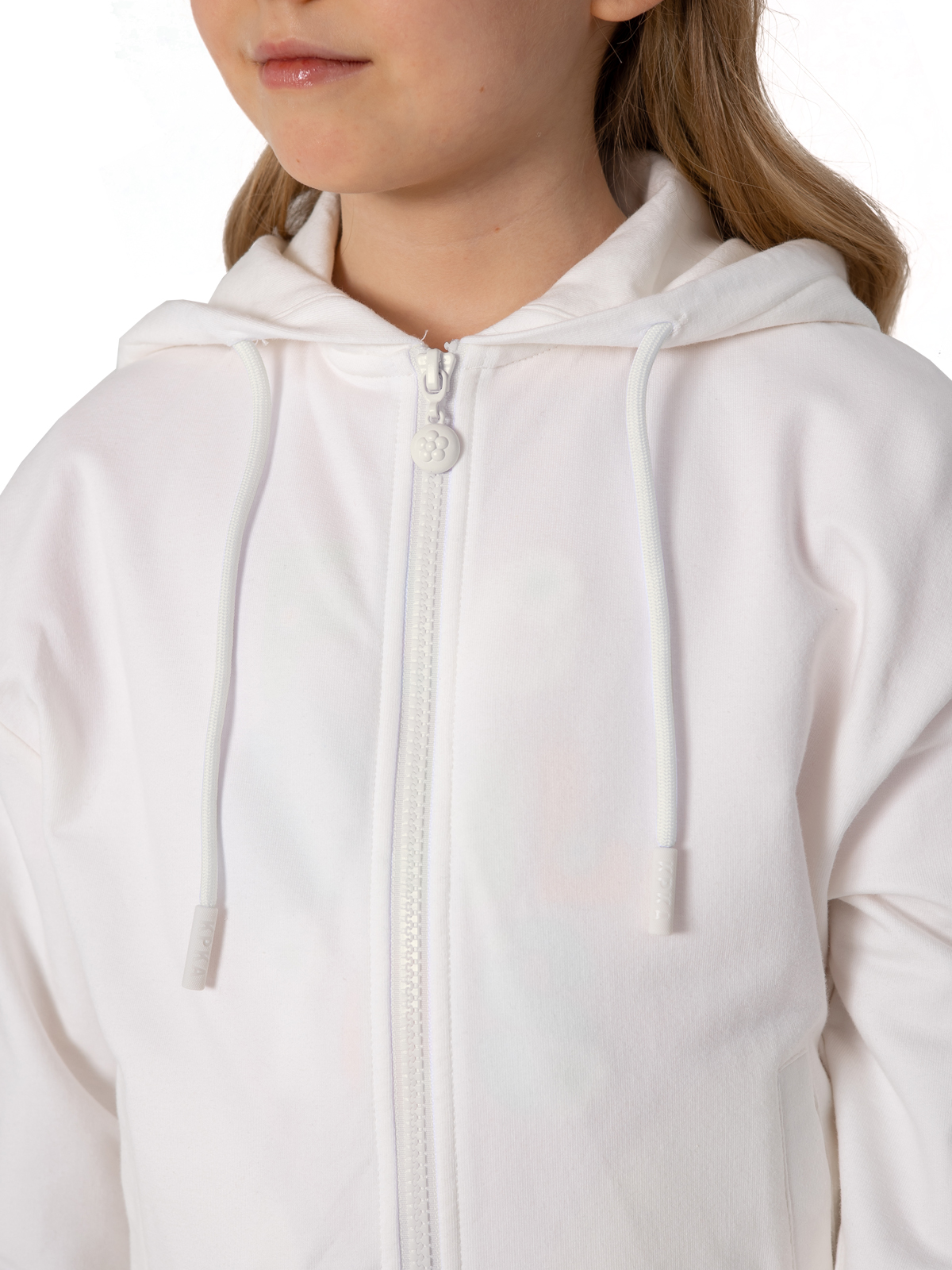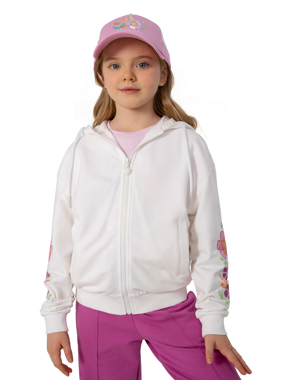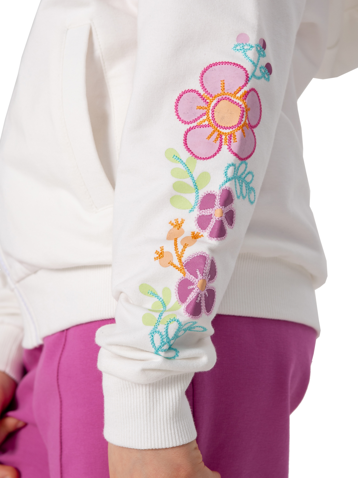 Стильная белая толстовка для девочки из мягкого материала на основе хлопка с добавлением эластана — идеальный выбор для создания модных образов. Благодаря составу ткани изделие отлично держит форму, приятно прилегает к телу и не теряет вид после стирки. Модель застегивается на молнию. Практичный капюшон с регулируемыми завязками обеспечивает защиту от ветра. Цветочные принты на рукавах придают изделию оригинальность. Два удобных прорезных кармана с листочками добавляют функциональности. Мягкие рибы по низу изделия и рукавам гарантируют комфортную посадку. Эта универсальная толстовка станет незаменимой частью гардероба юной модницы, сочетая практичность и модный дизайн.