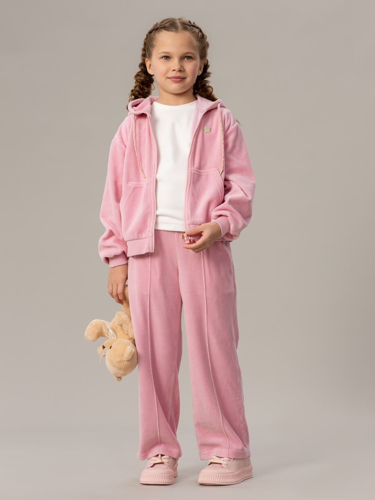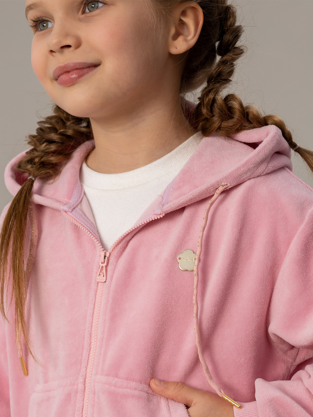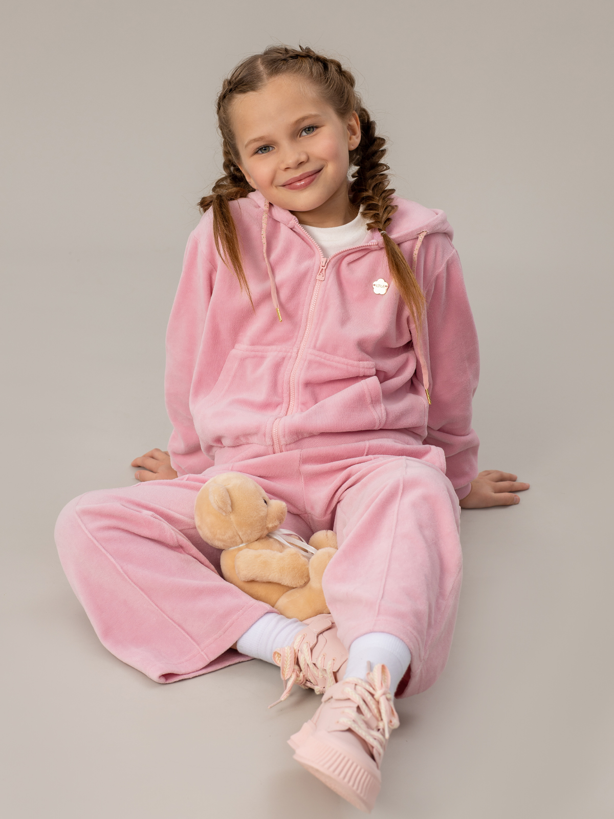 Мягкое худи из нежного велюра розового цвета — идеальный выбор для создания уютного образа. Модель дополнена практичной молнией, удобным карманом-кенгуру и эластичными рибами по низу рукавов и изделия, что обеспечивает комфортную посадку. Особенно стильно худи смотрится в комплекте с велюровыми брюками того же оттенка — такой дуэт создаст гармоничный и модный образ. Велюр приятен к телу, хорошо держит форму и прост в уходе. Сочетание комфорта и элегантности делает её незаменимой вещью в гардеробе современной девочки.