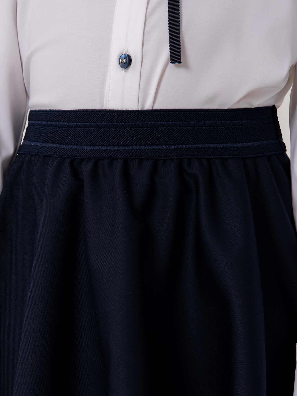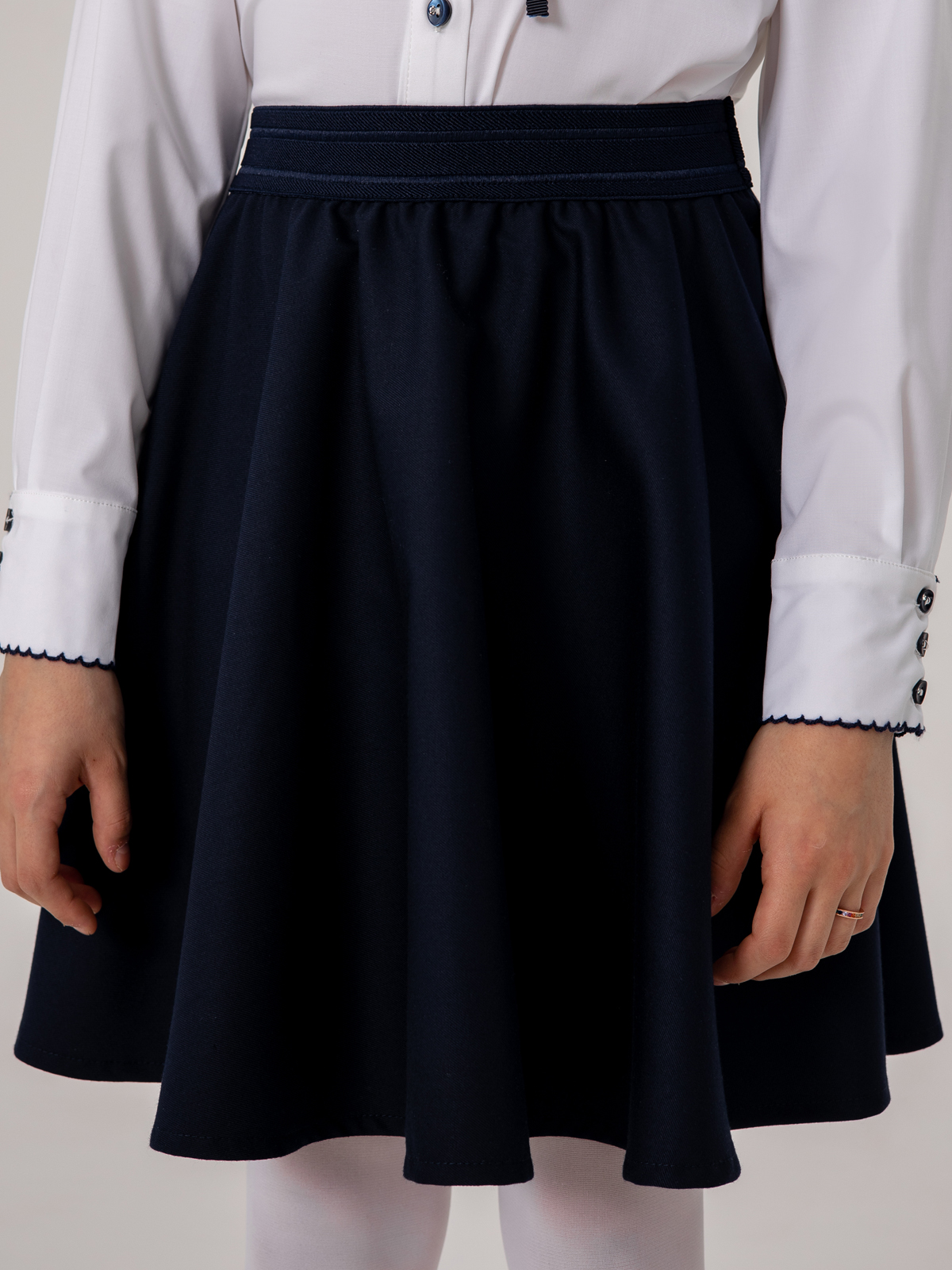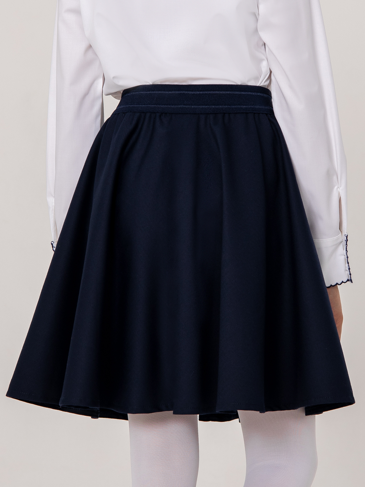 Темно-синяя школьная юбка выполнена из высококачественной костюмной поливискозы с высокой воздухопроницаемостью. Форма полусолнце. Ткань плотная, приятная на ощупь, не скатывается, сильно не мнется, износостойкая, не теряет форму и цвет после стирки. Юбка для школы легко надевается за счет эластичной резинки на поясе.