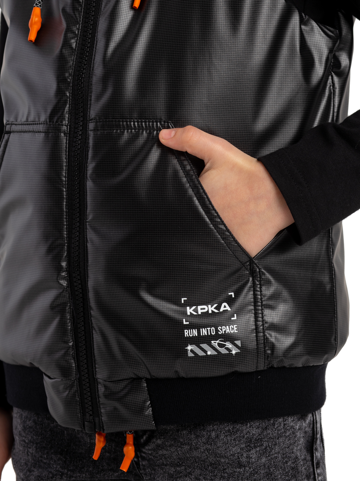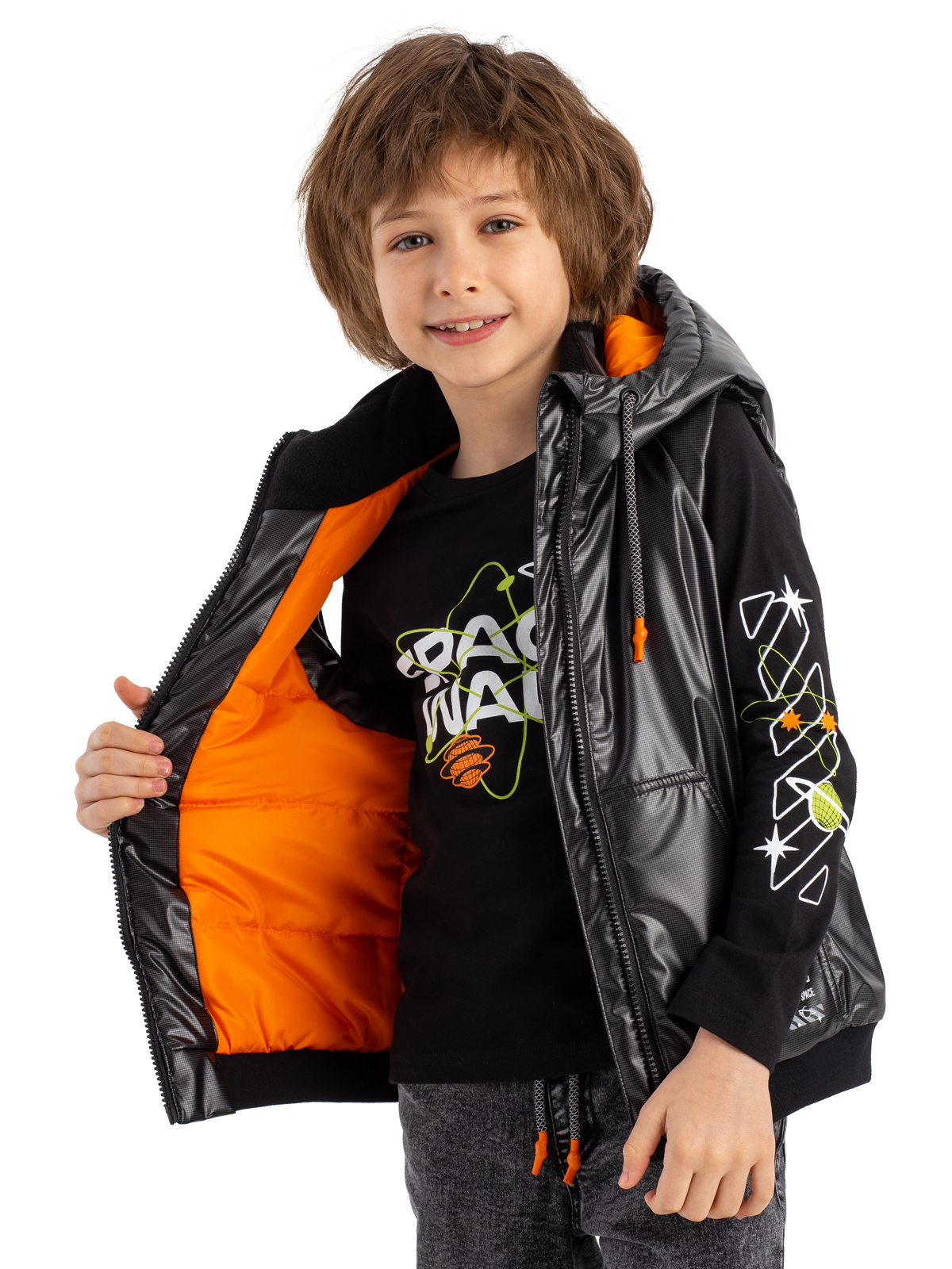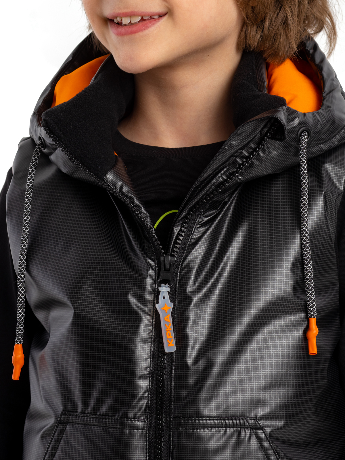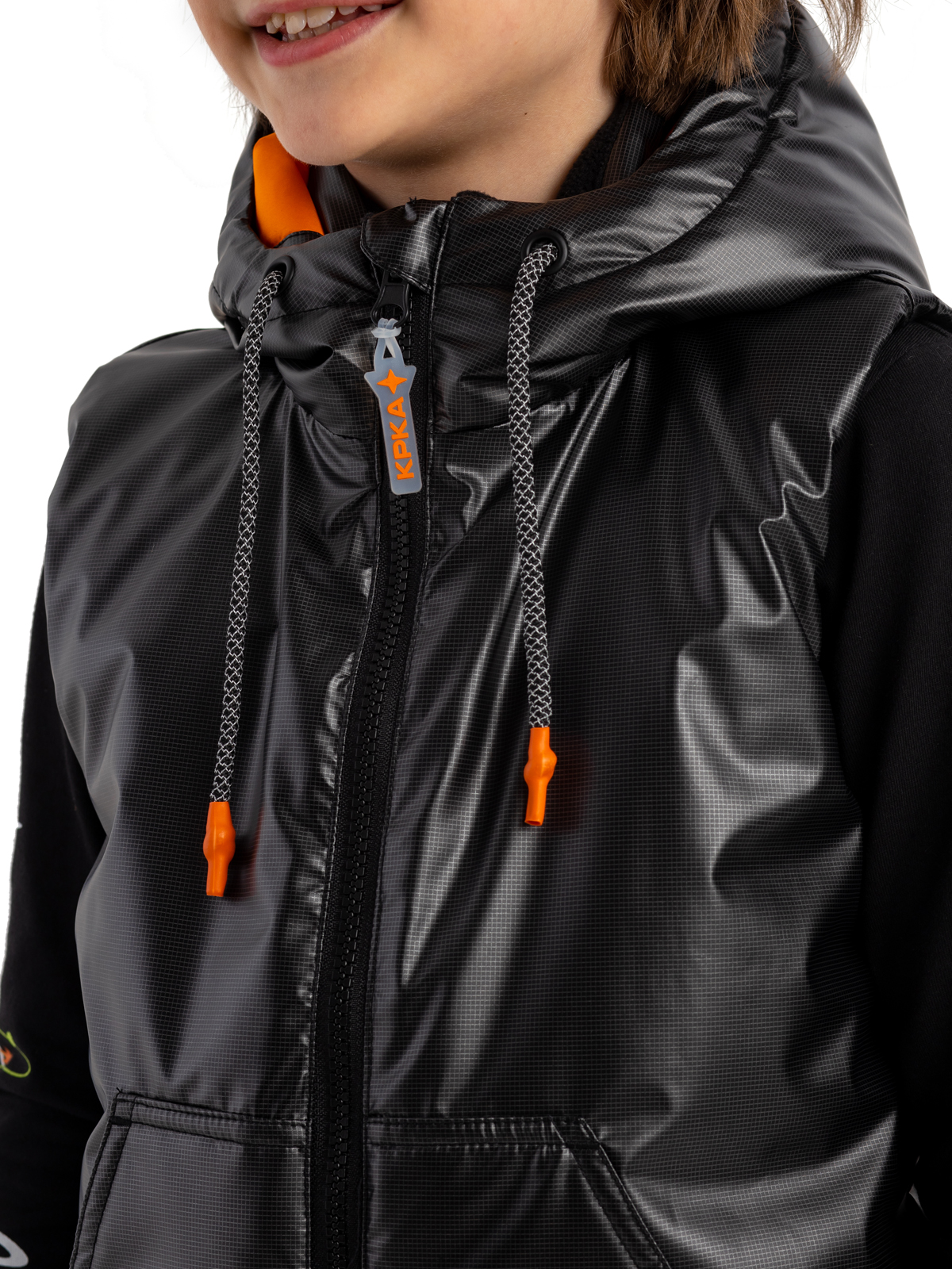 Классическая жилетка с несъемным капюшоном на регулируемой кулисе со светоотражающими шнурками. Дополнена утеплителем 160г/м2. Яркие акценты добавляют контрастная подкладка и контрастный шрифтовой принт на кармане.