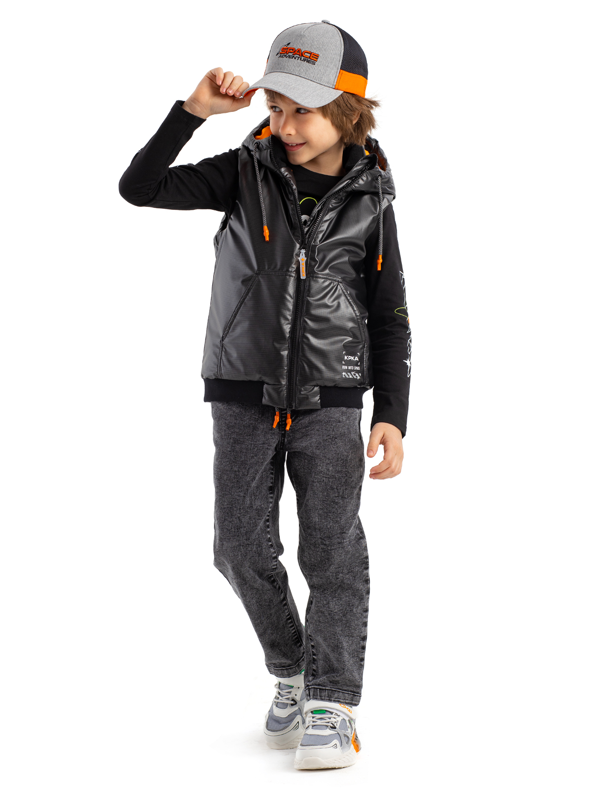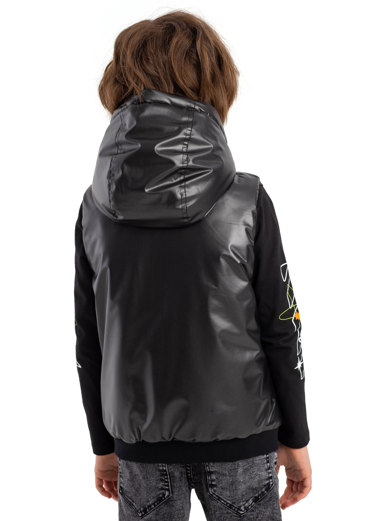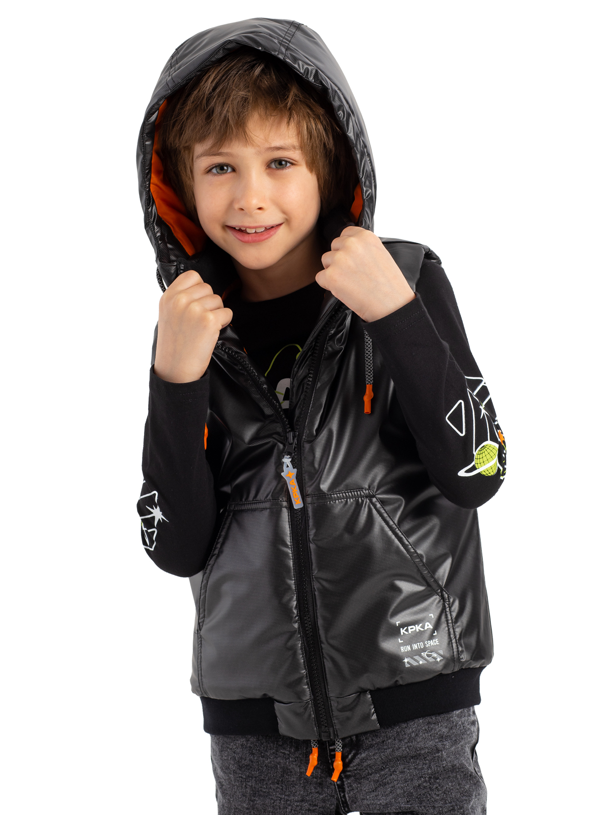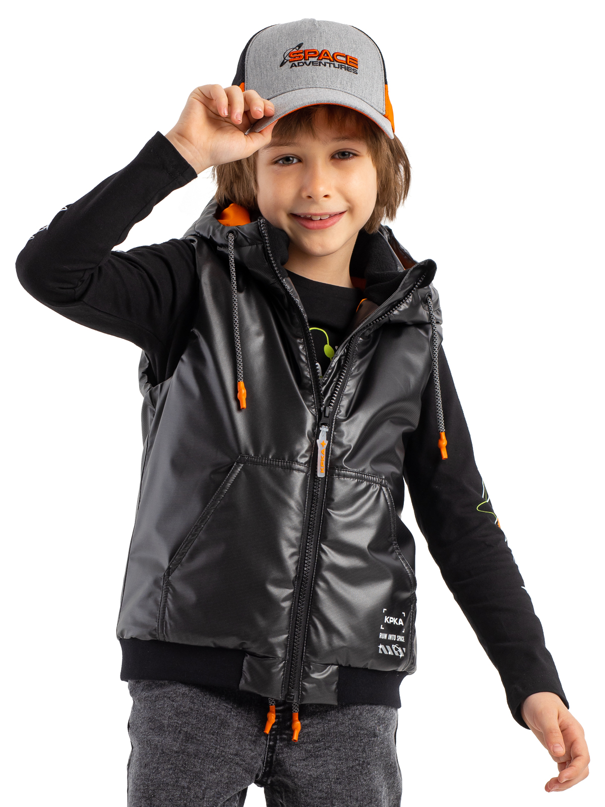 Классическая жилетка с несъемным капюшоном на регулируемой кулисе со светоотражающими шнурками. Дополнена утеплителем 160г/м2. Яркие акценты добавляют контрастная подкладка и контрастный шрифтовой принт на кармане.